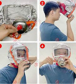 – Phần đầu mặt nạ làm bằng vật liệu chống cháy, bên ngoài phủ lớp màng bạc nhôm để ngăn sự bức xạ nhiệt cao, tránh gây tổn thương vùng đầu cho người đang thoát hiểm.